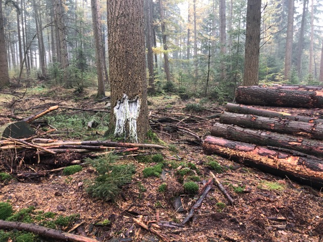 The men working in the forest didn’t blink an eye and greeted me courteously when I waded through the branches on the path in my three piece business suit. Walker versus tree managers, they probably didn’t realise they where a stranger presence here than I was. Since months the stacks of tree trunks alongside most of the wider paths have been growing. Unless you walk around very early, the bird sounds are drenched in the noise of motor saws.